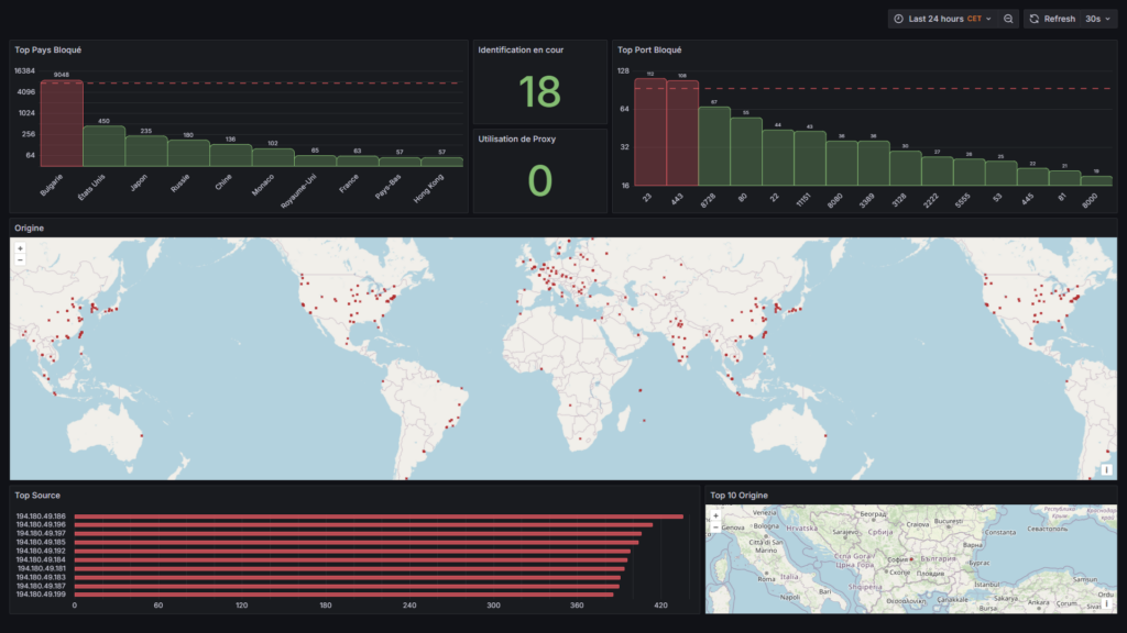 - Enrichissement des données : Les adresses IP identifiées par le pare-feu sont croisées avec plusieurs services tiers pour obtenir leur géolocalisation. Ces données sont ensuite insérées dans la base de données, fournissant une vue géographique des tentatives d’intrusion.